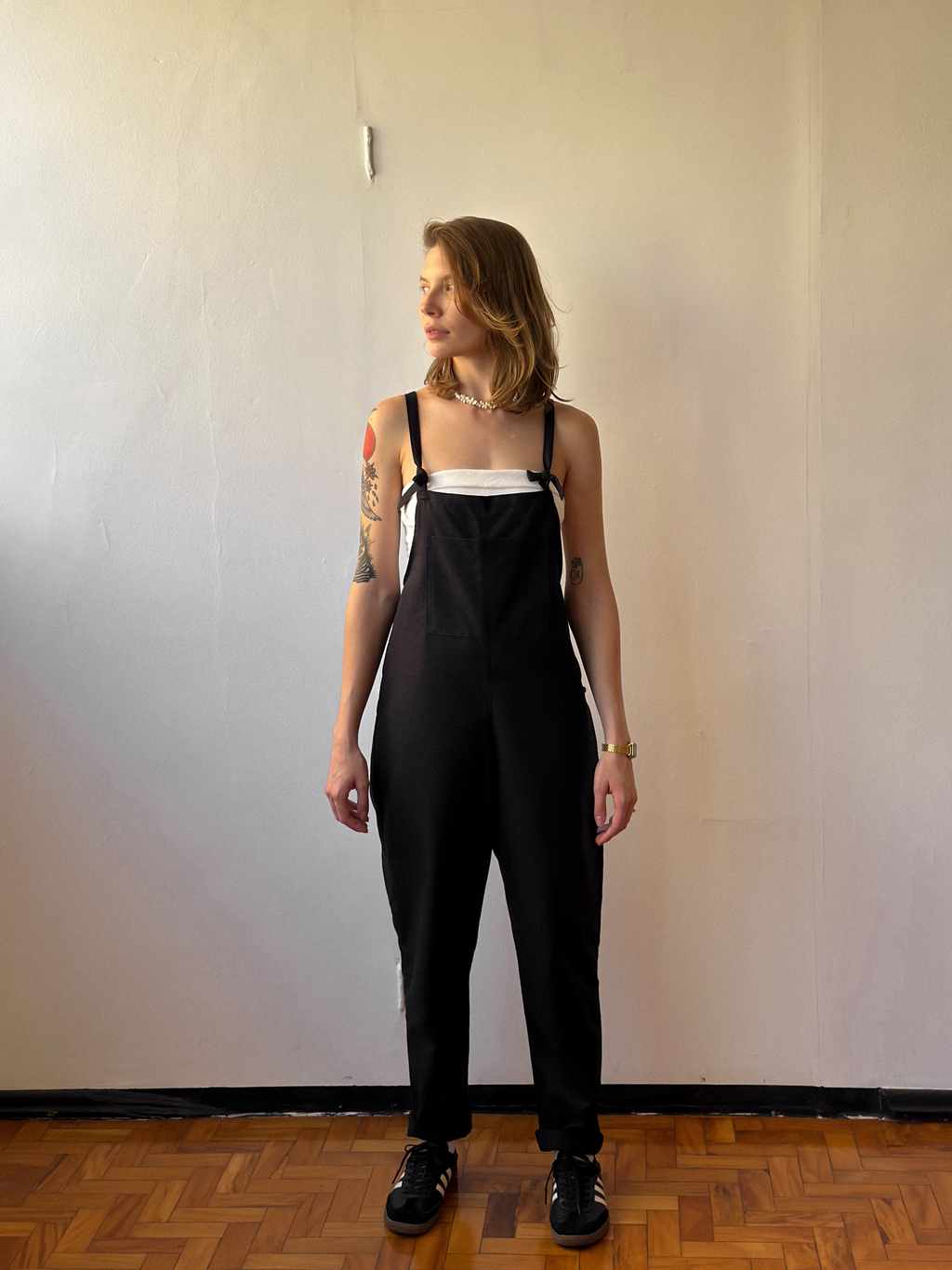 Descrição: A jardineira básica é uma peça super coringa para o dia-a-dia, divertida, confortável e jovial! Com ela seu look fica mais despojado. Possui corte reto e solto, alças com amarração e abertura em uma lateral, com três botões, além de bolsos nas costas e na frente.